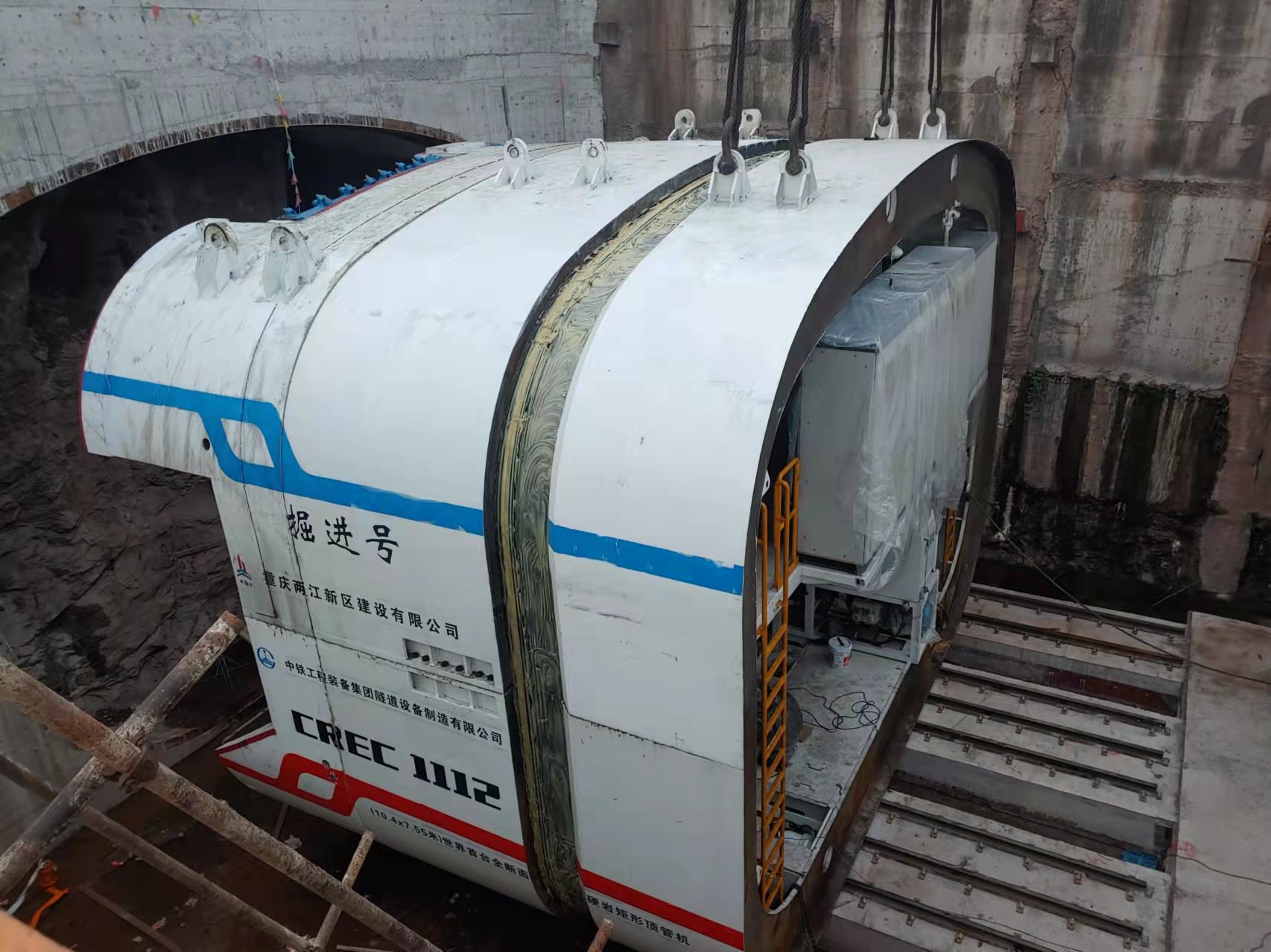 8月31日上午7時許,由兩江建設(shè)公司承建的北部新區(qū)人和組團(tuán)N區(qū)道路立交C交通節(jié)點配套A匝道頂管工程迎來了重大施工節(jié)點。開挖面寬10.42m、高7.57m、重達(dá)500噸的盾體順利完成吊裝下井作業(yè)。此次吊裝下井的矩形頂管機(jī)是世界首臺全斷面的硬巖矩形頂管機(jī),同時這也是該設(shè)備的首次下井吊裝作業(yè)。